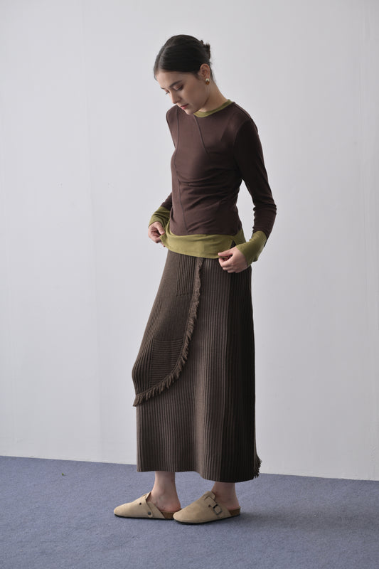 羊毛混紡不規則拼色冷裙 Wool-blend Fringed Contrast Rib-knit Midi Skirt